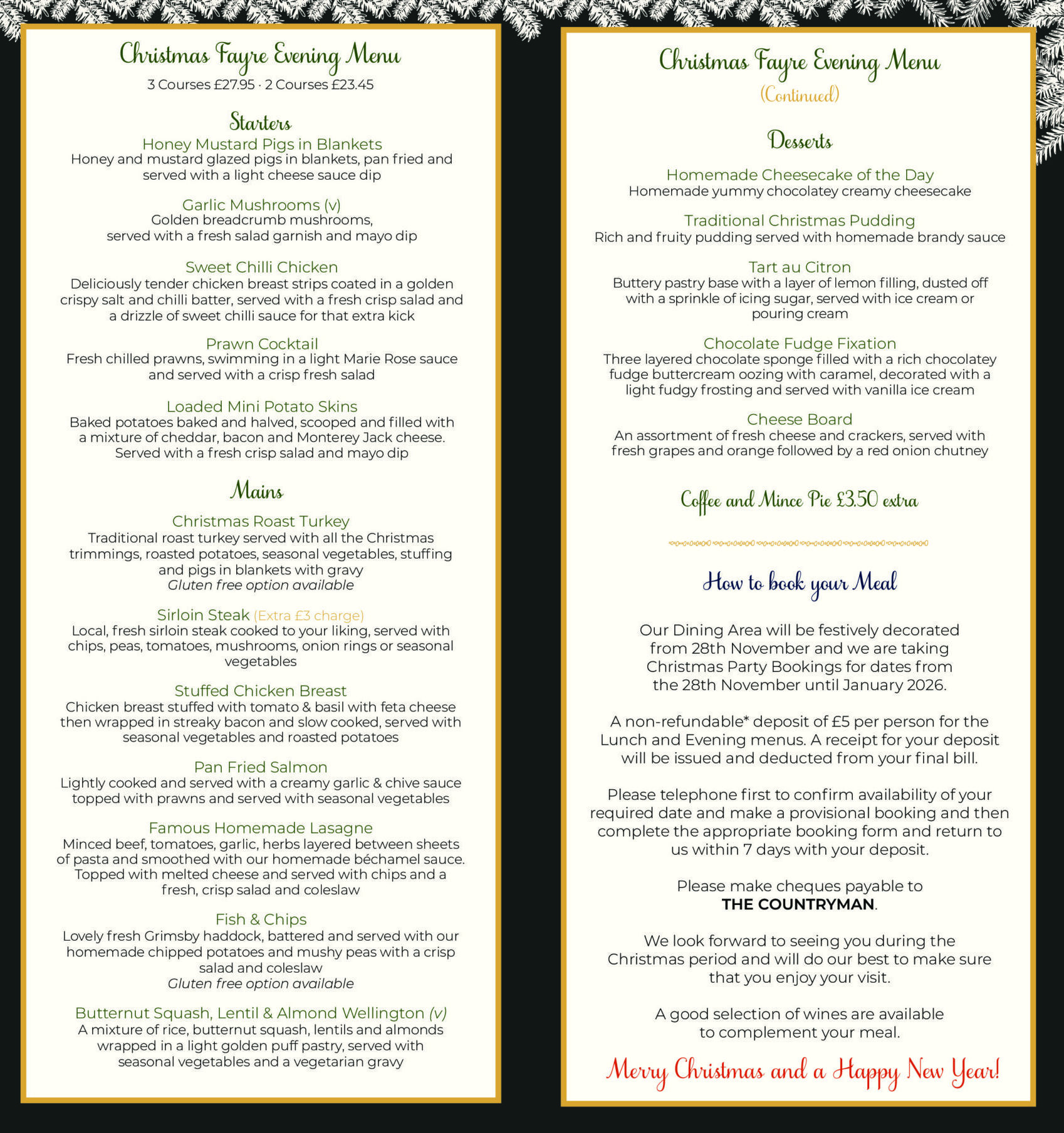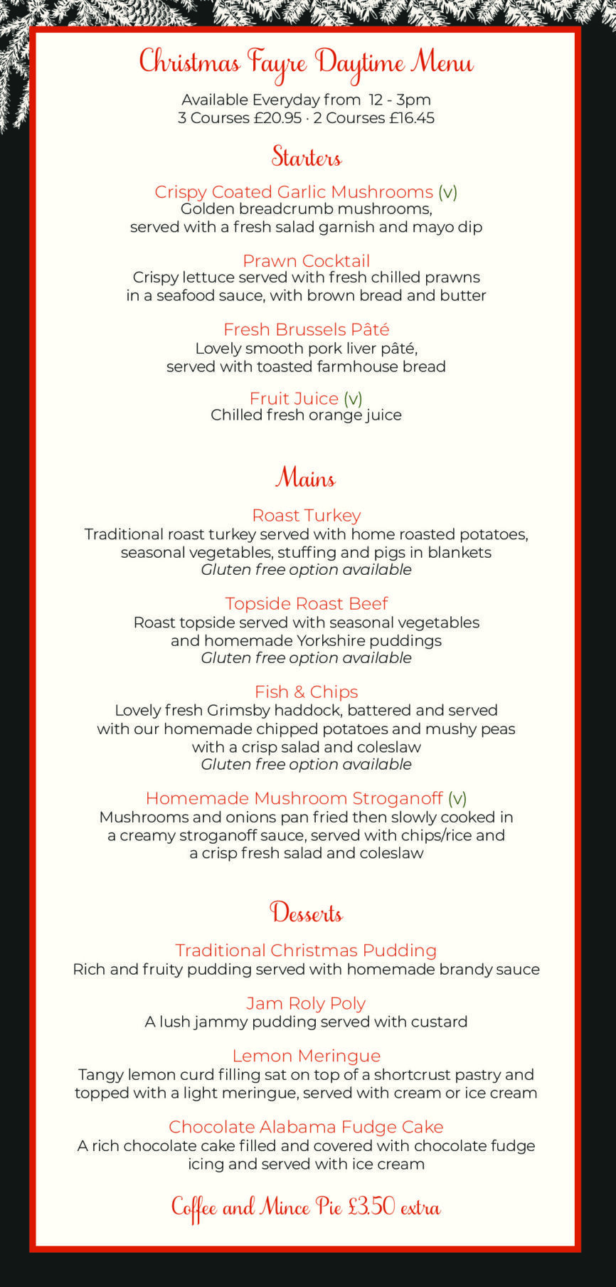 Christmas 25 click here for a printable pdf version of our Christmas menus Christmas Fayre Daytime Menu Christmas Fayre Evening Menu click here for a printable pdf version of our Christmas menus